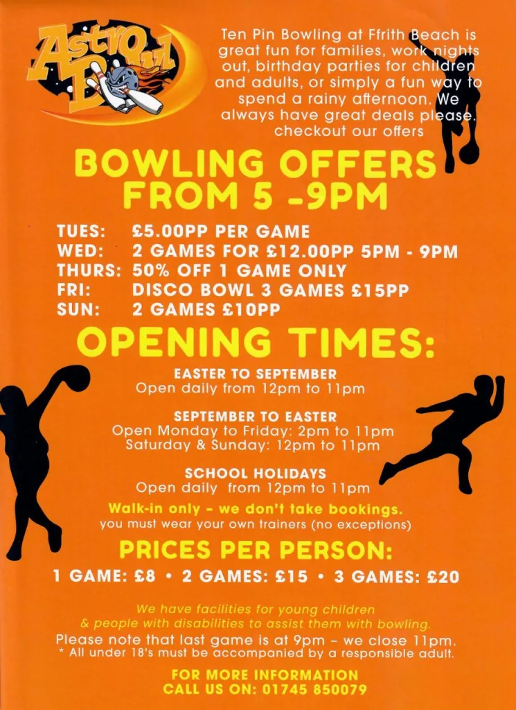 Price including shoe hire for a ten frame game. For more information call Astrobowl on 01745 850079